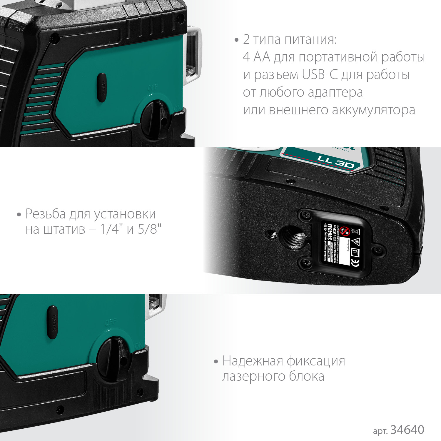 • 3 режима проецирования линий: горизонтальная и две вертикальные линии с развёрткой 360°, благодаря чему луч будет виден в любой точке.