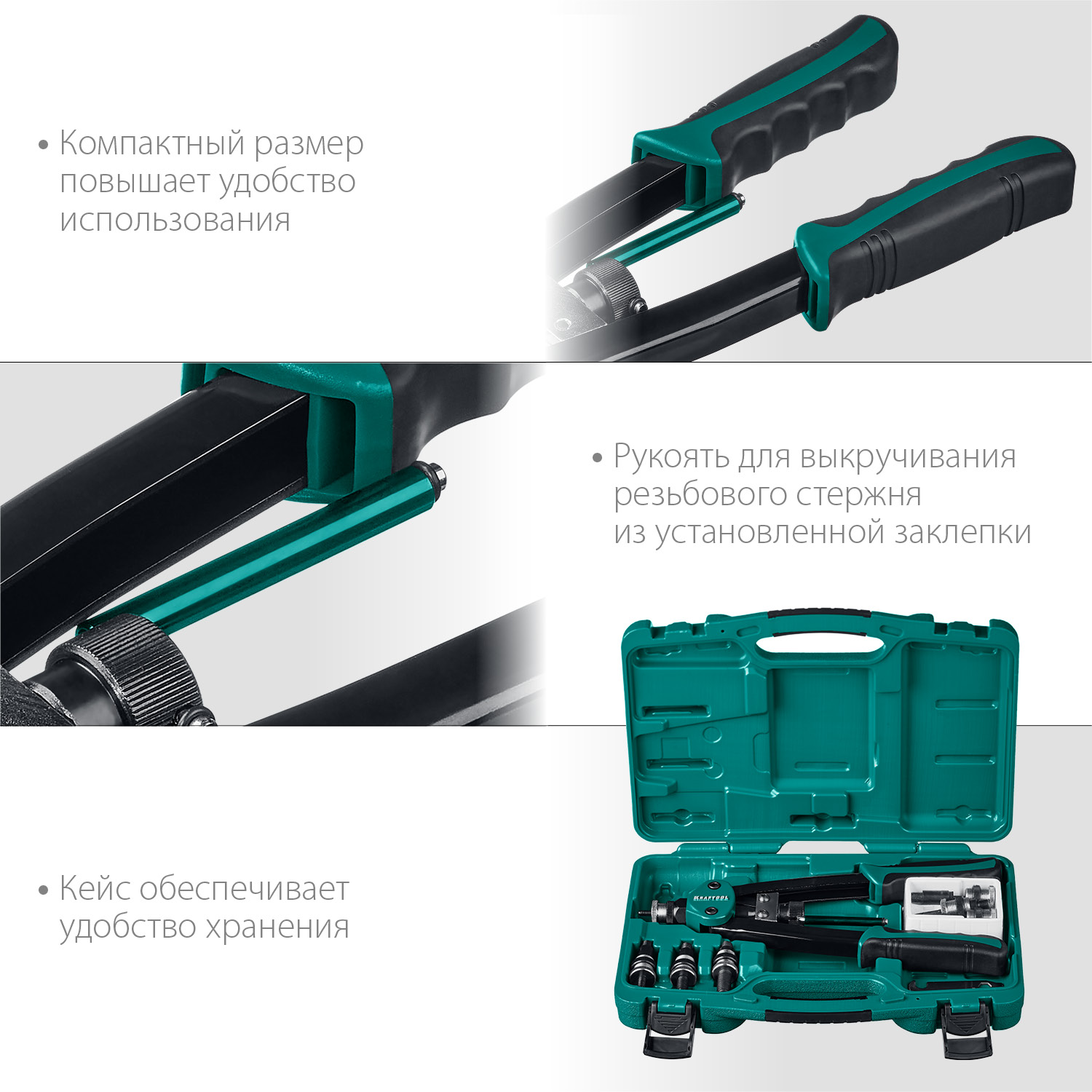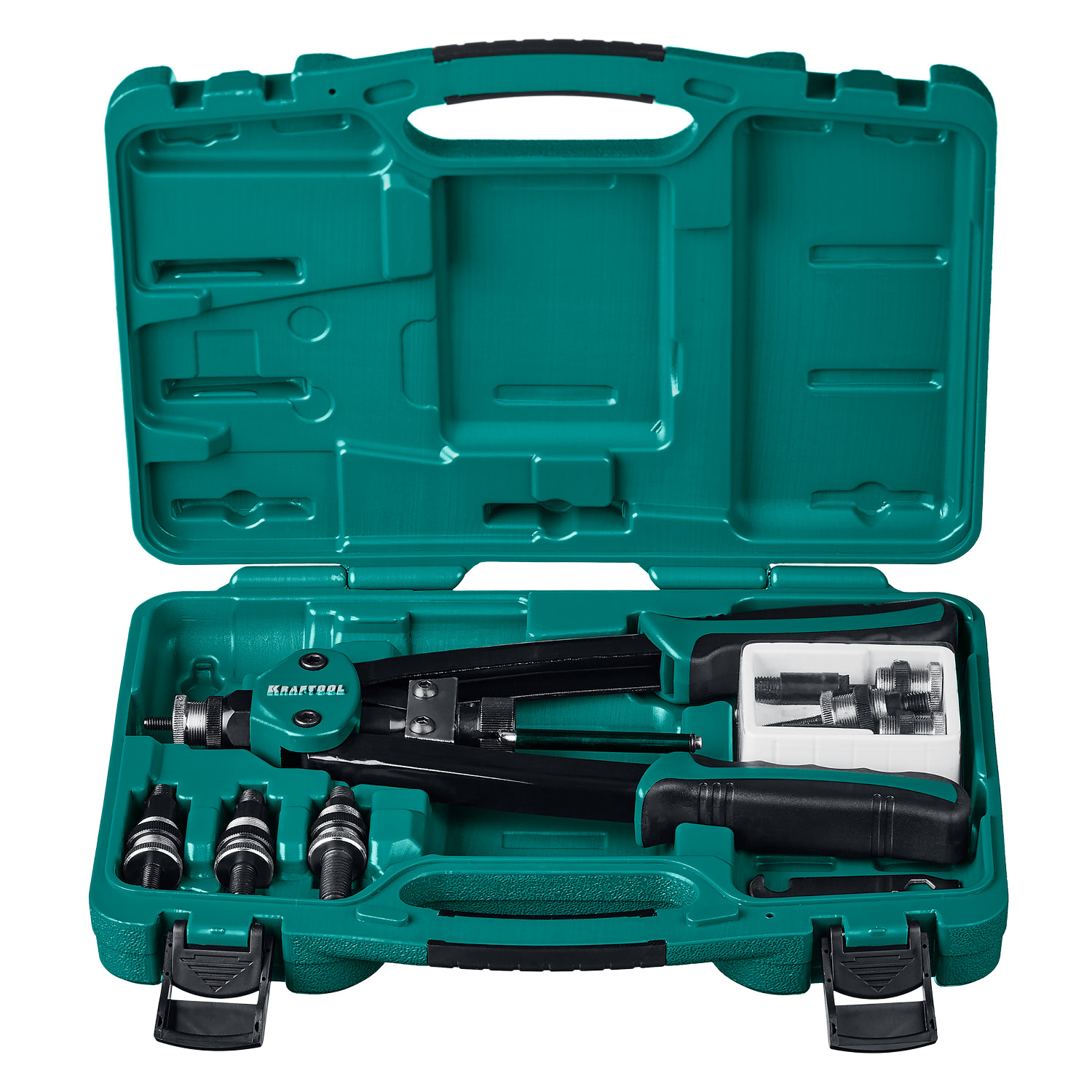 Двуручный резьбовой заклепочник KRAFTOOL выдерживает высокие рабочие нагрузки и предназначен для установки резьбовых заклепок из алюминия, стали и нержавеющей стали.