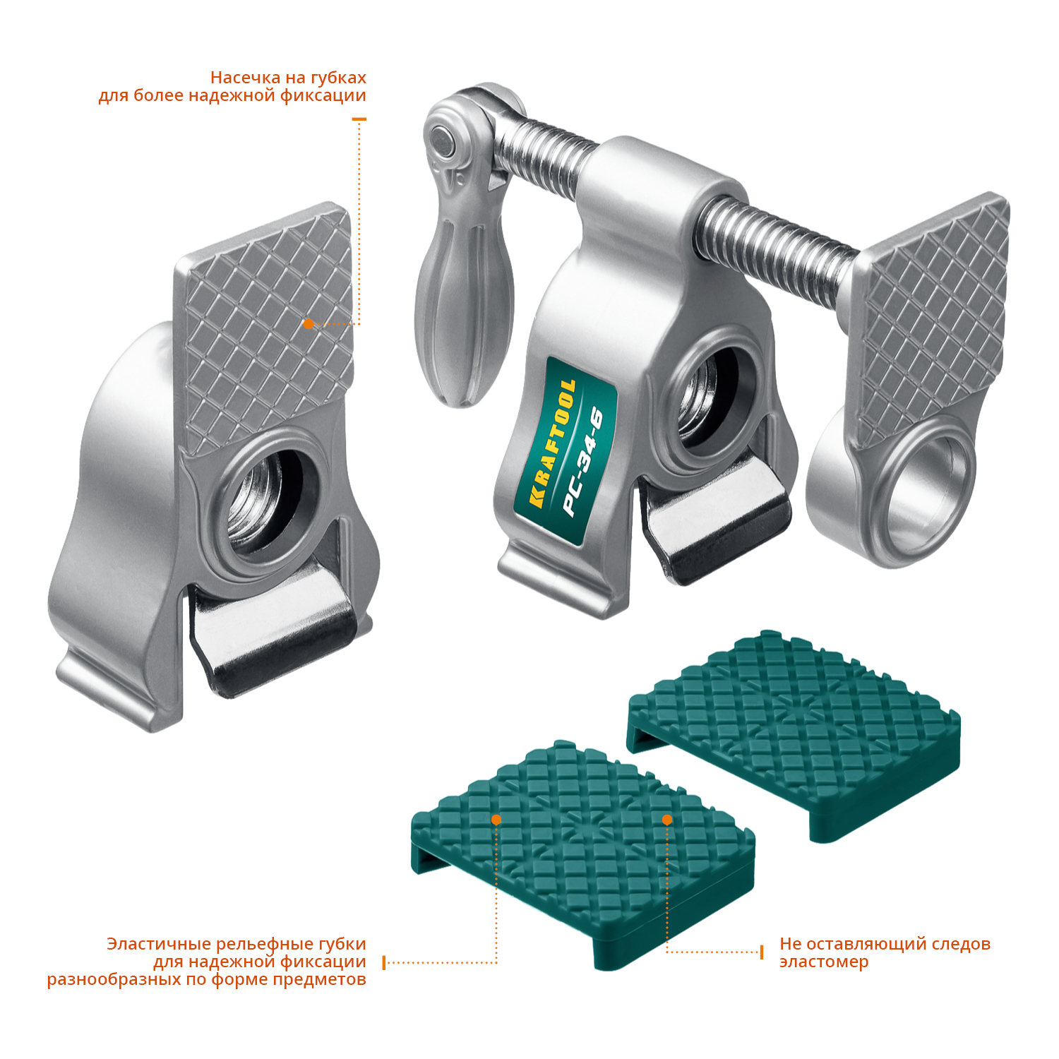 Трубная струбцина KRAFTOOL PC-34-6 с неограниченной шириной захвата - надежный зажимной/распорный инструмент. Удобная рычажно-поворотная рукоятка, широкие ножки в основании, мягкие накладки на губки - обеспечивают максимальный комфорт при выполении работ. Усилие - до 600 кгс.