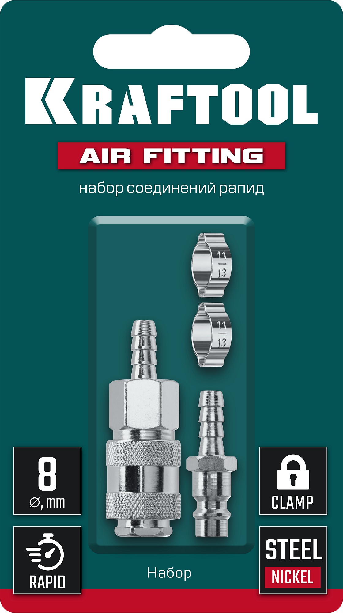 KRAFTOOL (штуцер ″елочка″, 8 мм - рапид муфта) + (рапид штуцер-штуцер ″елочка″, 8 мм) + (обжимные хомуты 2 шт), набор (06599-08-H)