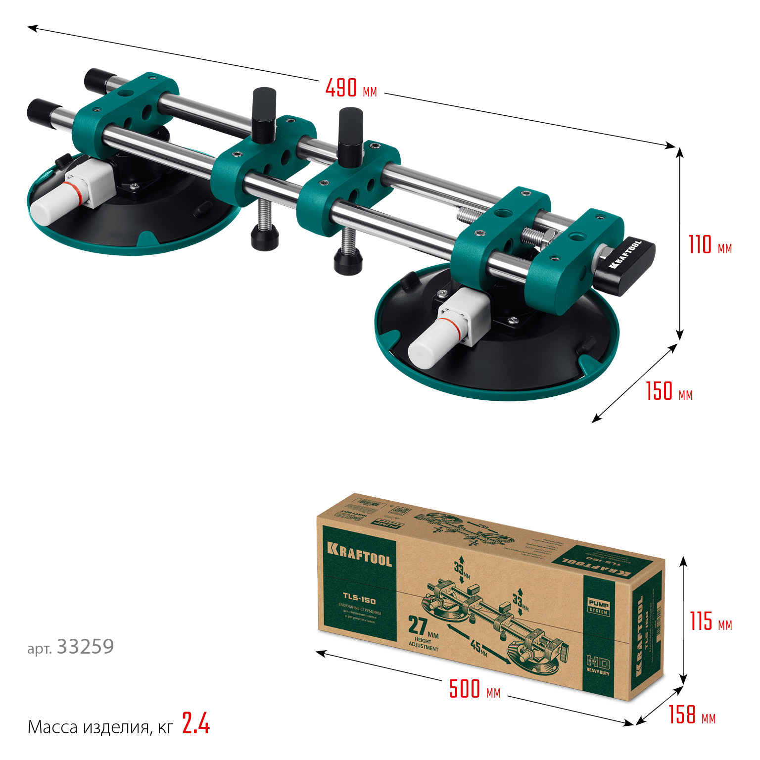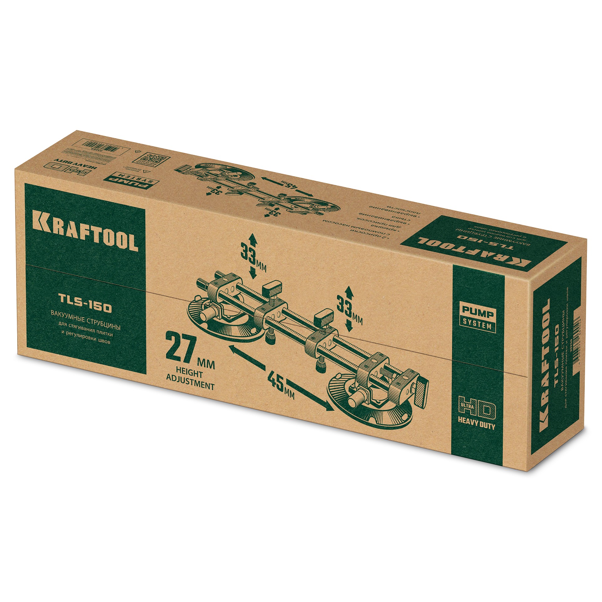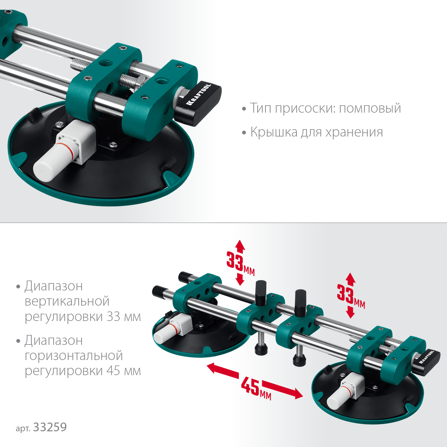 Струбцина с двумя присосками имеет помповые насосы, что позволяет создать нагрузку на шов до 150 кг. Три регулятора позволяют отрегулировать расстояние между двумя плитками и их высоту по плоскости. Крышки на присосках защищают их от загрязнения при хранении и трнспортировке