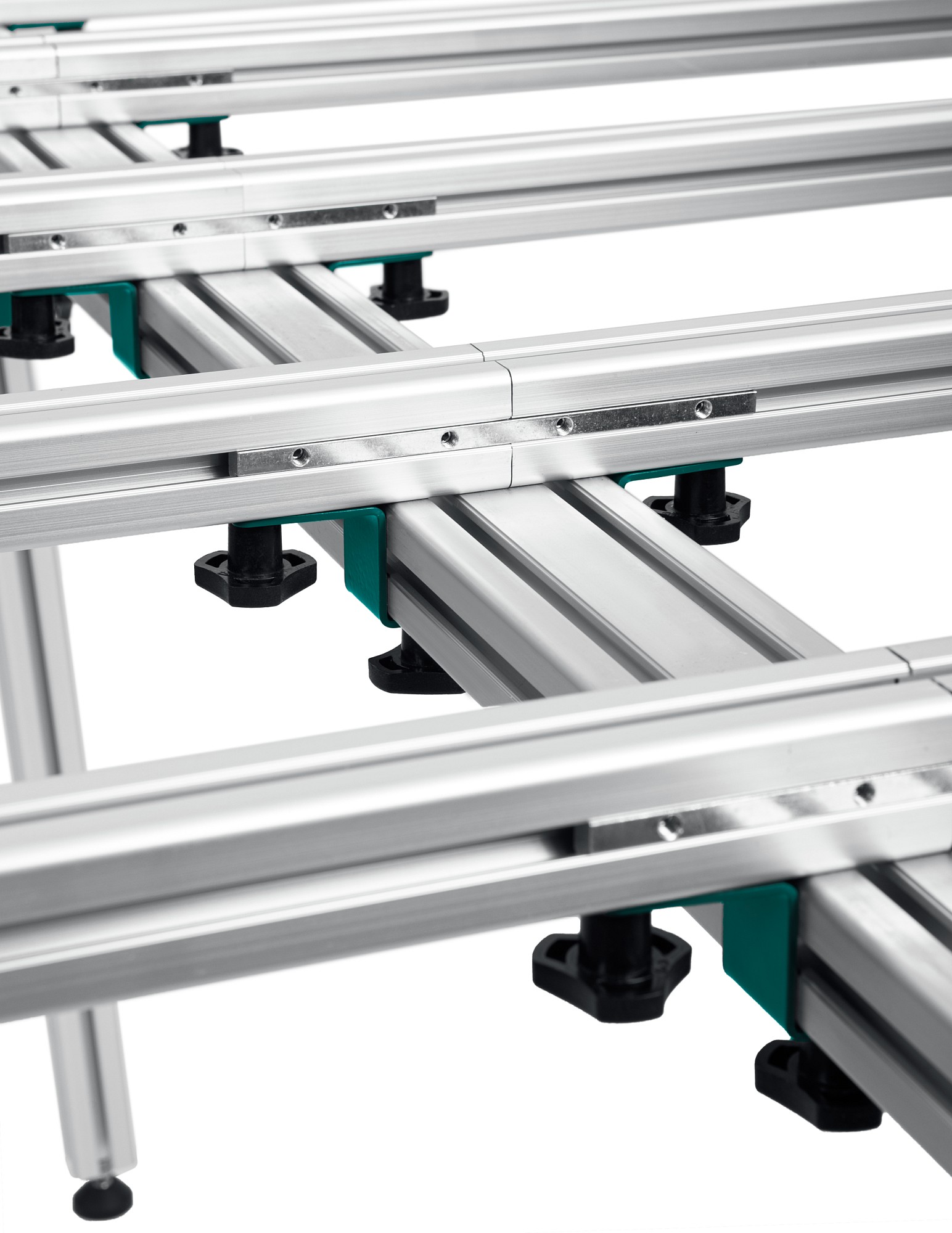 Быстросборная конструкция позволяет компактно хранить, перевозить и собирать стол. Легко масштабируется благодаря плавающим направляющим. Упоры ножек стола позваляют настроить высоту на неровной поверхности. Максимальная нагрузка 250 кг.