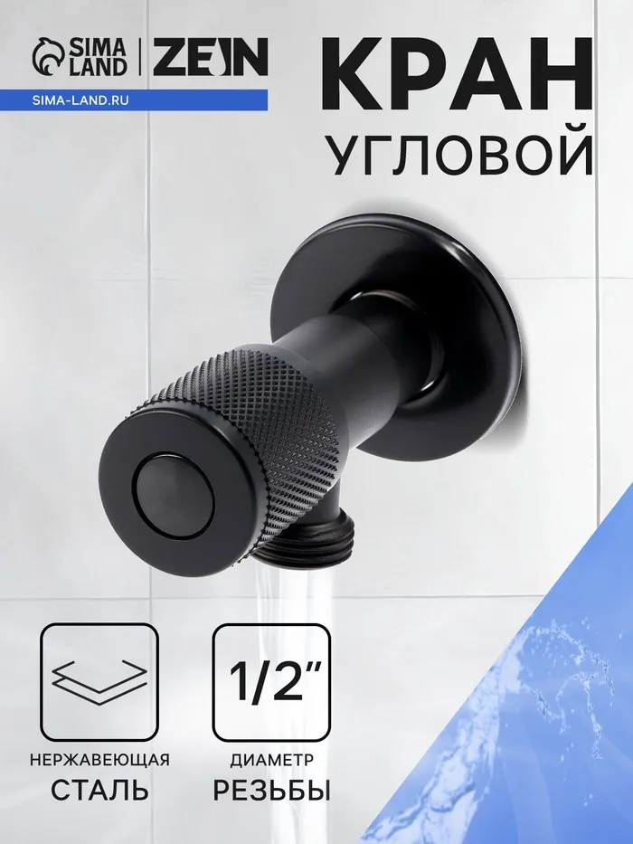 Кран угловой ZEIN engr, 1/2" х 1/2", кран-букса латунь/керамика, нерж. сталь, черный