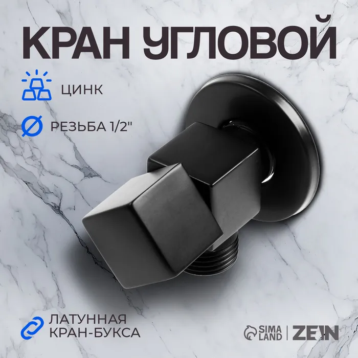 Кран угловой ZEIN engr, 1/2" х 1/2", квадратный, кран-букса латунь, цинк, черный