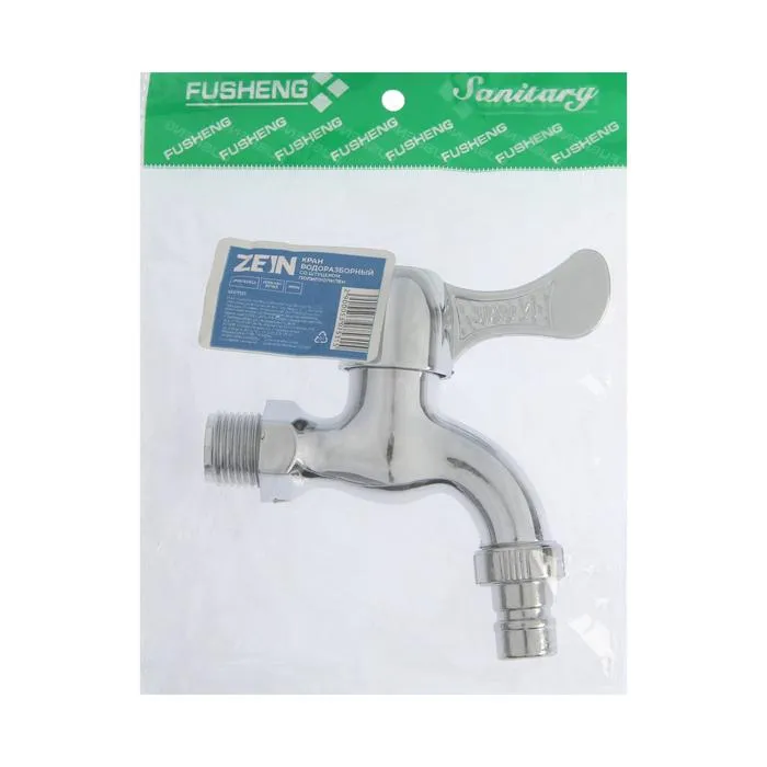 Кран водоразборный со штуцером ZEIN, 1/2", плоская ручка, цинк, кран-букса, хром