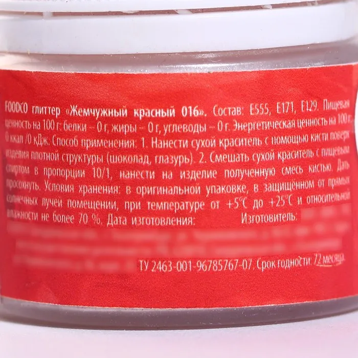 Сверкающий пищевой краситель "Жемчужный красный" с эффектом блеска применяется для окрашивания кондитерских десертов, выпечки и жидкости. Использовать пищевой краситель можно в трёх вариантах: в сухом виде, нанося кисточкой на поверхность; развести краситель в густой среде (например, в креме) и тогда продукт будет окрашен равномерно; растворить краситель в жидкости (например, в коктейле) и тогда блёстки осядут на дно.