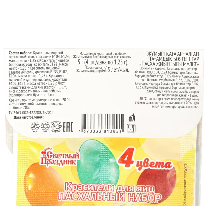 Пищевые красители абсолютно безопасны и безвредны для здоровья, поэтому можно без опасения, давать такие разноцветные декорированные яйца детям. На упаковке с краской Вы найдете инструкцию о том, как правильно окрасить яйца к пасхе. Также можно дополнить декор наклейками из набора, которые привлекут внимание любого ребенка.