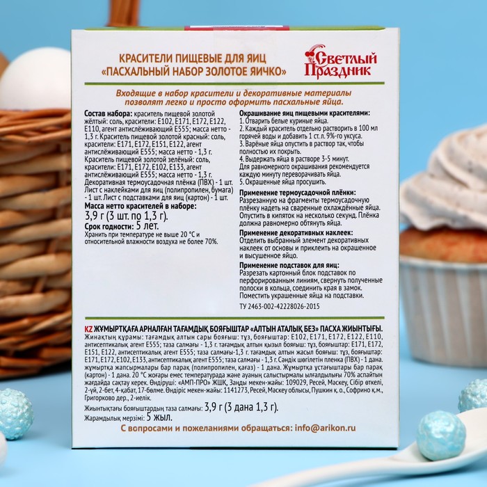 В состав пасхального набора пищевых красителей для яиц "Золотое яичко" входят термоэтикетки, наклейки, подставки и "золотые красители". На упаковке с краской Вы найдете полную инструкцию, которая научит, как правильно окрасить яйца к Пасхе. Также можно дополнить декор стразами или ручной росписью.