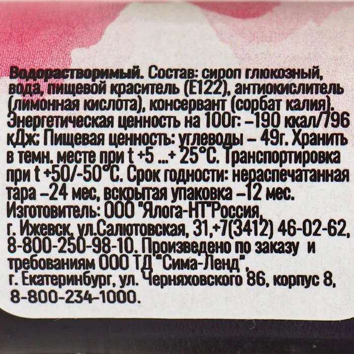 Состав: сироп глюкозный, вода, пищевой краситель (Е122), антиокислитель (лимонная кислота), консервант (сорбат калия).