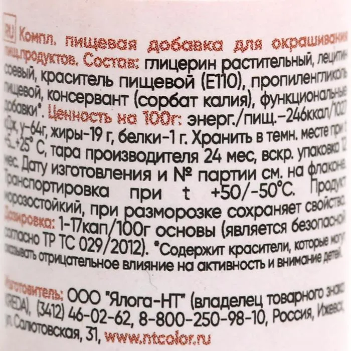 Колорант Oil-gel предназначен для окрашивания таких продуктов, как растительные сливки и крем на их основе, растительные масла, соусы)
