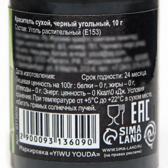 Краситель сухой "Кондимир" — это мощный инструмент для создания эффектных кулинарных шедевров. Этот качественный порошковый краситель из угольного пигмента идеально подходит для окрашивания различных продуктов, придавая им насыщенный черный цвет.