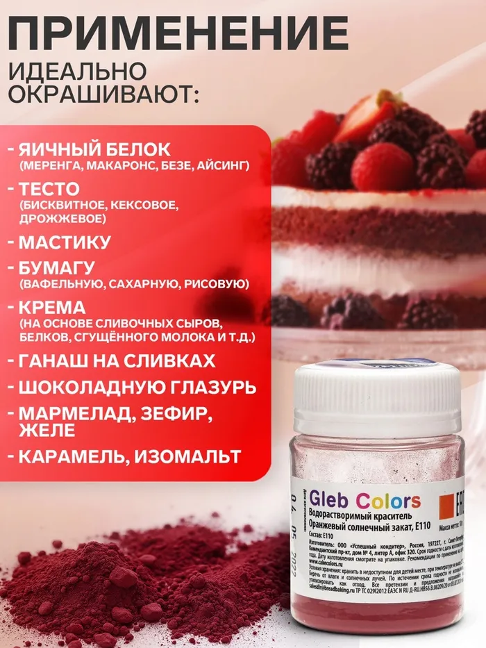 Краситель безопасен для здоровья и не влияет на вкус готовых изделий, что делает его отличным выбором как для профессиональных кулинаров, так и для домашних кондитеров. Благодаря своей универсальности, он идеально сочетается с другими ингредиентами и позволяет вам создавать уникальные и запоминающиеся блюда.
