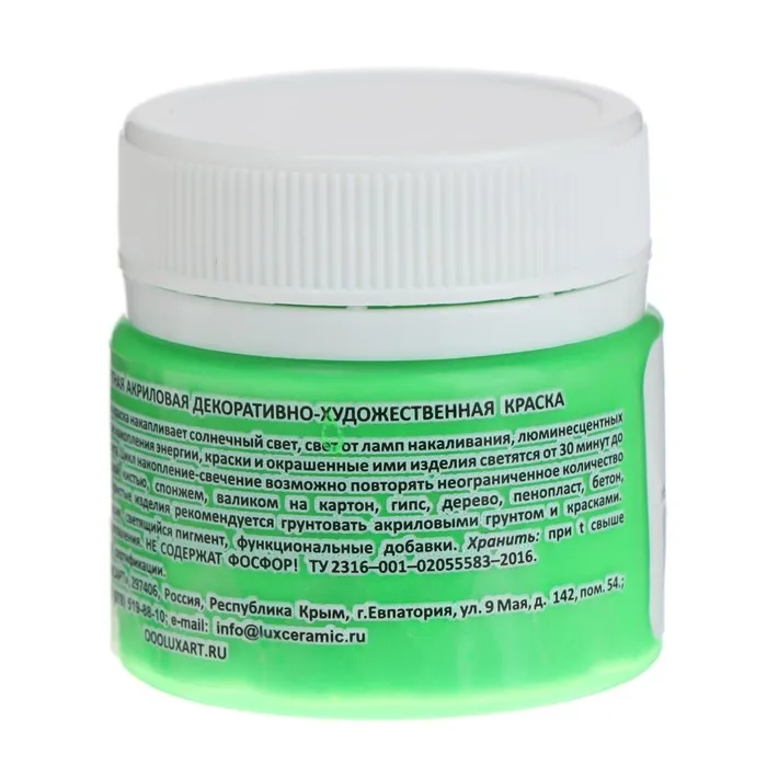 Цикл накопление-свечение возможно повторять неограниченное количество раз Наносится синтетической кистью, спонжем, валиком на картон, гипс, дерево, пенопласт, бетон, бумагу, керамику и др. Пористые изделия рекомендуется грунтовать акриловыми грунтом и красками, чтобы максимально выровнять поверхность для равномерного свечения. Не содержит ФОСФОР!