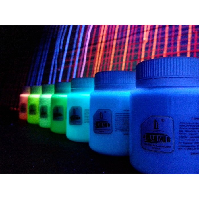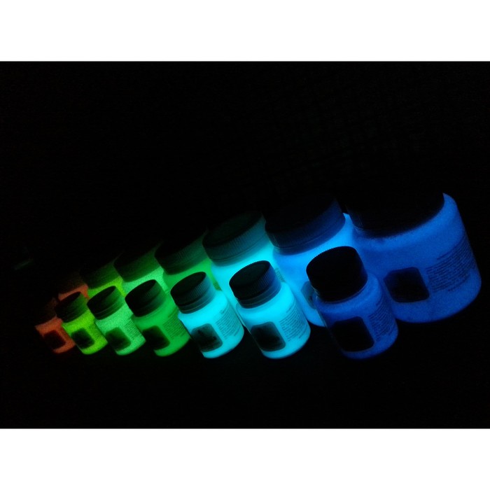 Люминесцентная акриловая краска накапливает солнечный свет, свет от ламп накаливания, люминисцентных ламп, УФ-излучателей. После накопления энергии, краски и окрашенные ими изделия светятся от 30 минут до 3 часов, в зависимости от цвета.
