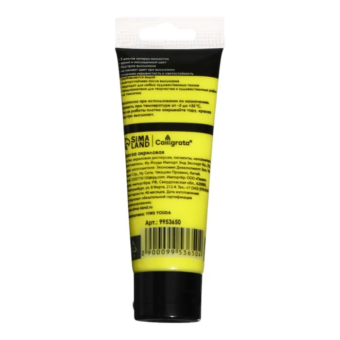 Краска акриловая матовая в тубе 75мл CALLIGRATA, КМ002, Желтая лимонная, пантон 3945С — Характеристики