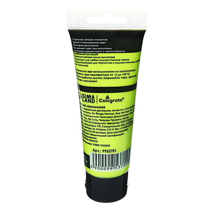Краска акриловая матовая в тубе 75мл CALLIGRATA, КМ057, Желто-зеленая светлая, пантон 2290С — Характеристики