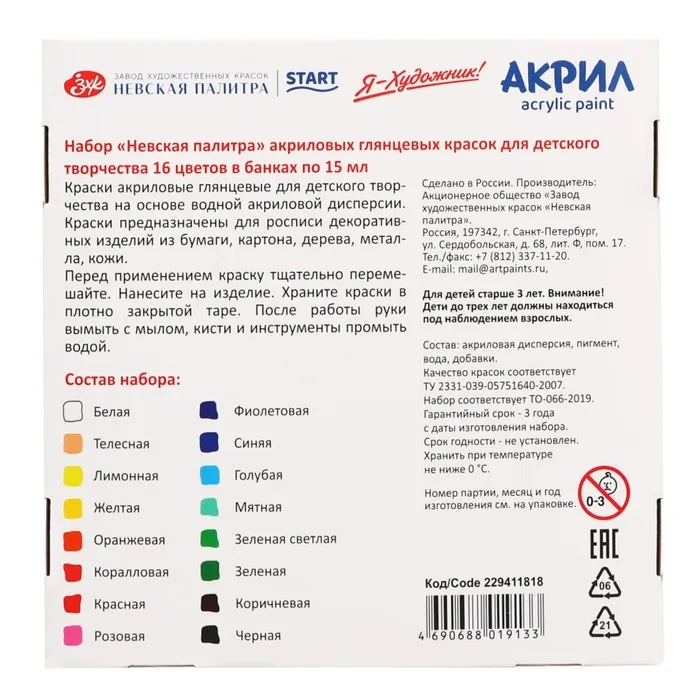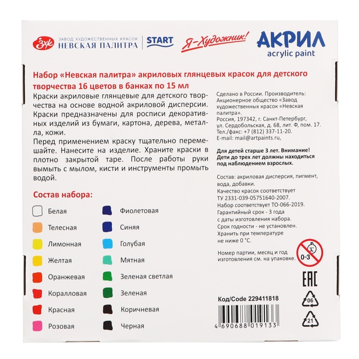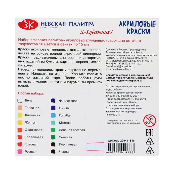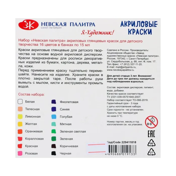 Краска акриловая, набор 16 цветов х 15 мл, "Я - Художник!", глянцевые — Характеристики
