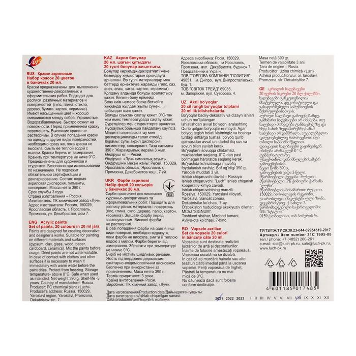 Краска акриловая, набор 20 цветов х 20 мл, "Луч", художественные — Характеристики