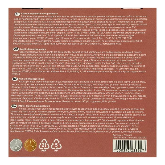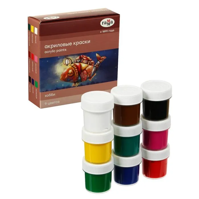 Акриловые краски серии "Хобби" предназначены для декоративно-оформительских работ и росписи бумаги, картона, холста, дерева, металла, гипса. Краски обладают высокой укрывистостью, хорошо смешиваются и быстро высыхают. После высыхания создают на поверхности глянцевый красочный слой. Акрил "Хобби" морозостиойкий, выдерживает транспортировку при низких температурах. Благодаря удобной герметичной баночке с завинчивающейся крышкой, краски долго хранятся, не высыхая. В наборе 9 цветов: белый, жёлтый, изумрудный, розовый, красный, коричневый, зелёный, синий, чёрный. Объём одной баночки — 20 мл, общий объём — 180 мл.