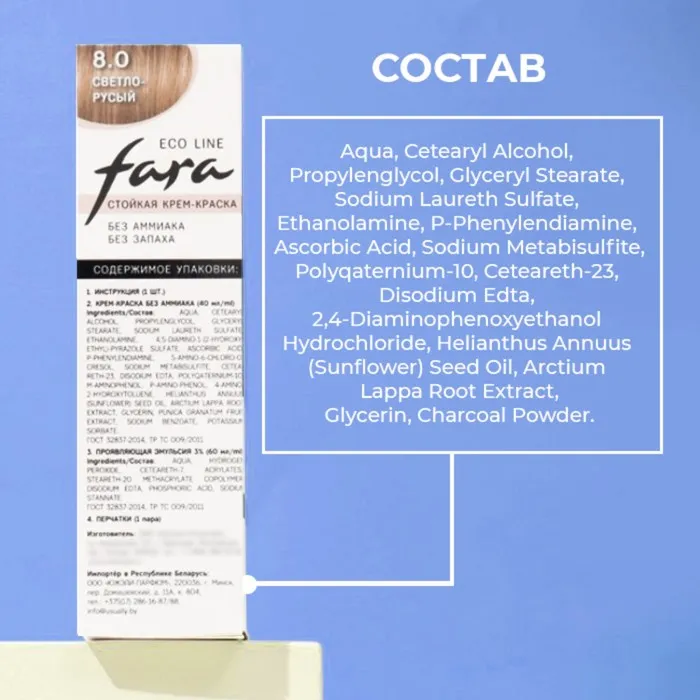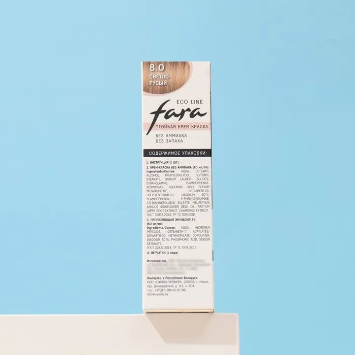 Fara Eco Line — стойкая крем-краска без аммиака и без запаха со 100% натуральным репейным маслом обеспечивает стойкий эффект окрашивания, яркий насыщенный цвет, щадящее воздействие и бережный уход за волосами от самой природы. Специально подобранный для оттенка 8.0 дополнительный активный компонент — натуральный экстракт ромашки увлажняет и питает кожу, успокаивает и восстанавливает, нормализует обменные процессы и работу сальных желез, а также смягчает волосы и придает им здоровый блеск.
