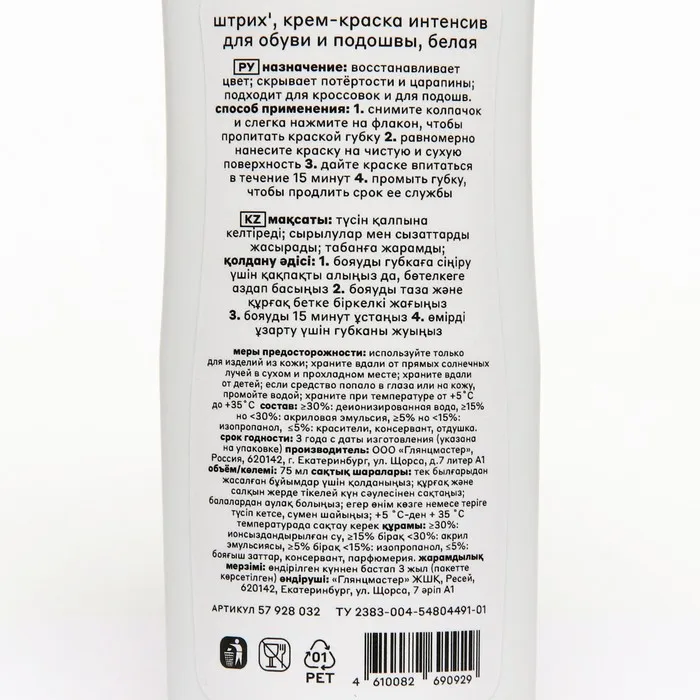 Назначение: восстанавливает цвет, скрывает потёртости и царапины, подходит для кроссовок и для подошв.