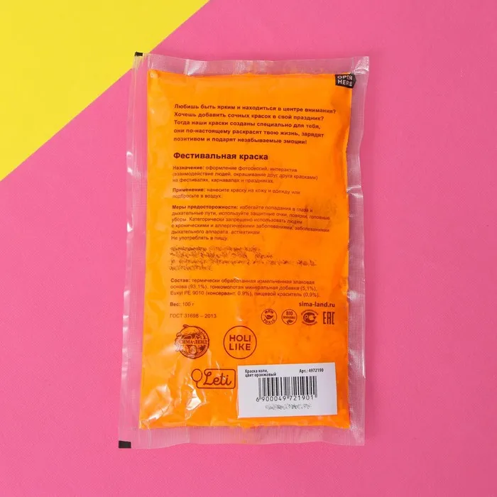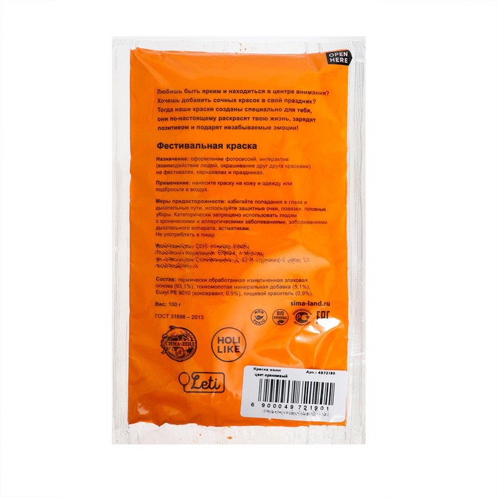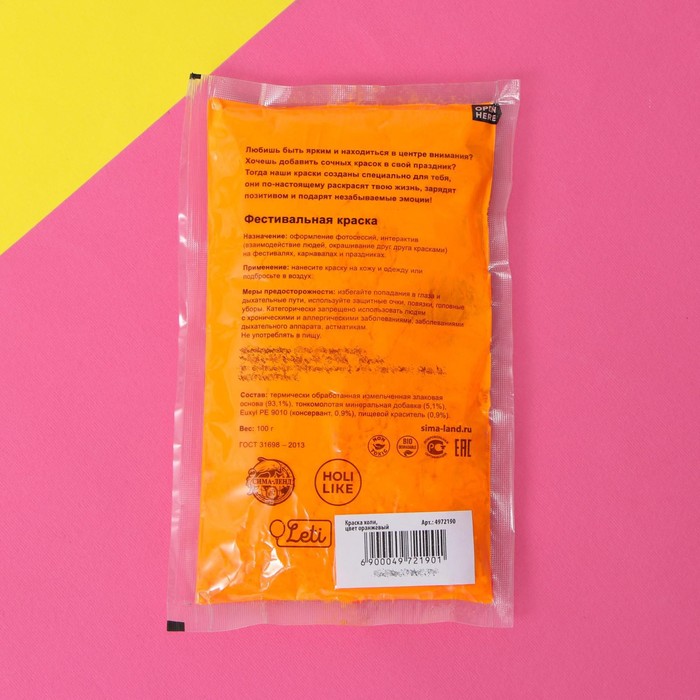 Краска холи, цвет оранжевый, 100 г — Характеристики