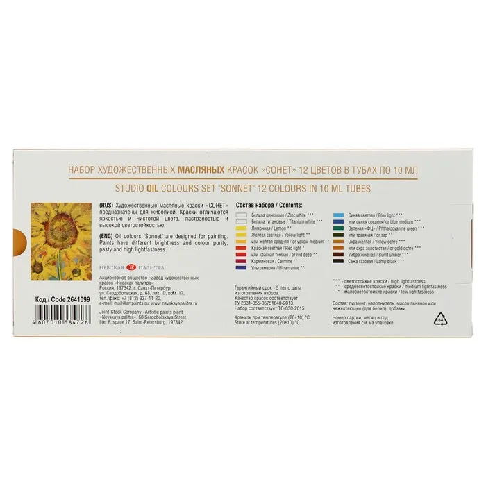 Масляные художественные краски серии "Сонет" разработаны по традиционным технологиям с использованием современных материалов и предназначены для живописи.