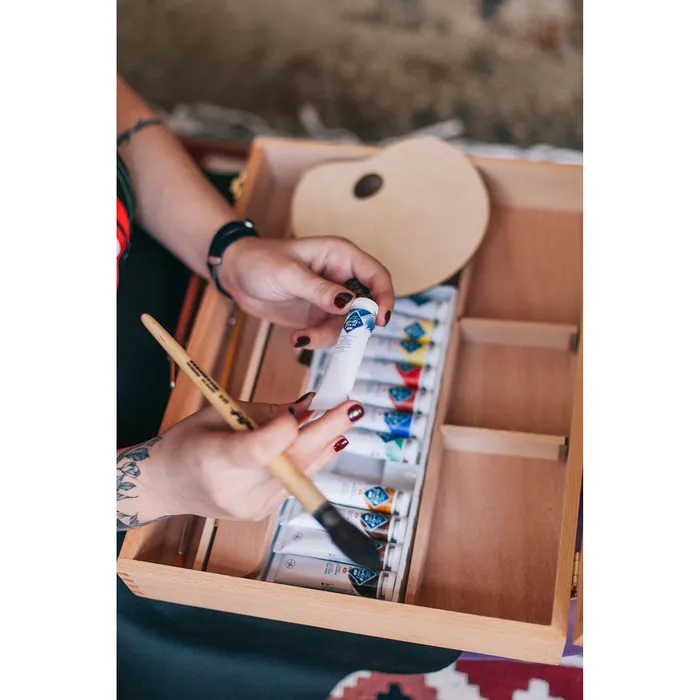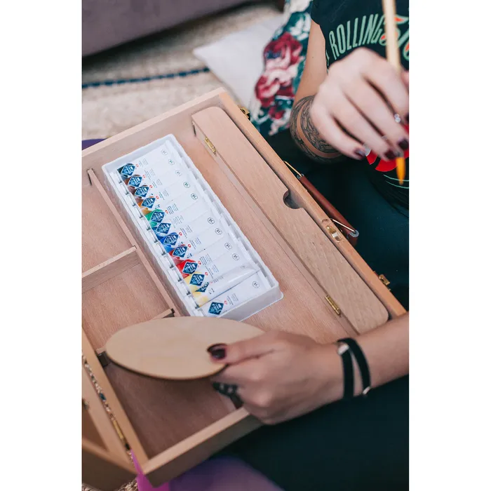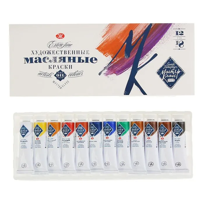 Масляные краски изготавливаются по традиционным рецептурам на основе высококачественных натуральных пигментов (земляных, кадмиевых, кобальтовых и железоокисных), связующего – специально обработанного льняного масла и натуральных смол. Яркие насыщенные тонкодисперсные краски с высокой концентрацией пигмента не меняют цвета после высыхания. Обладают пастозной консистенцией. Легко разносятся от корпусного до лессирующего слоя.