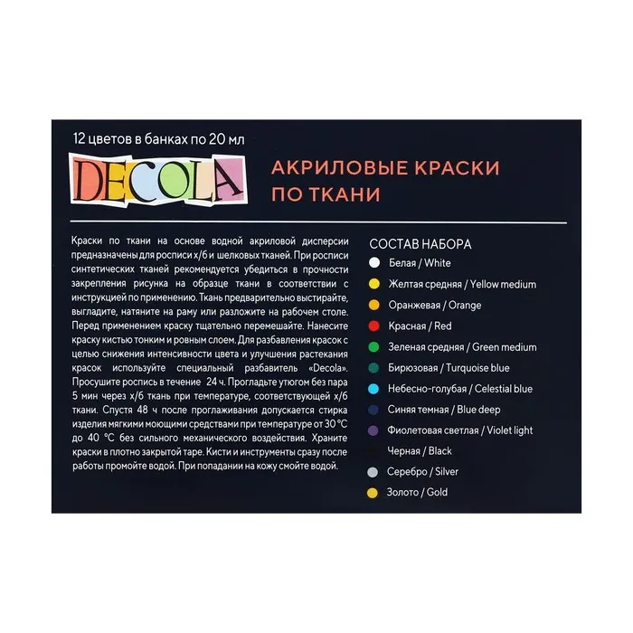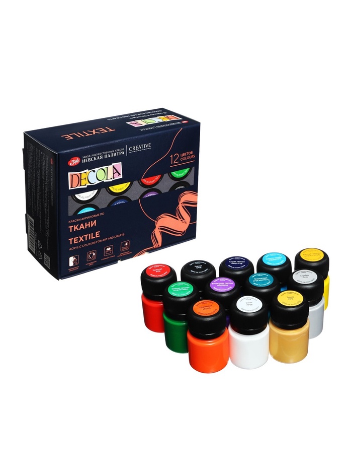 Краска по ткани, набор 12 цветов х 20 мл, ЗХК Decola, акриловая на водной основе, (4141216) — Характеристики