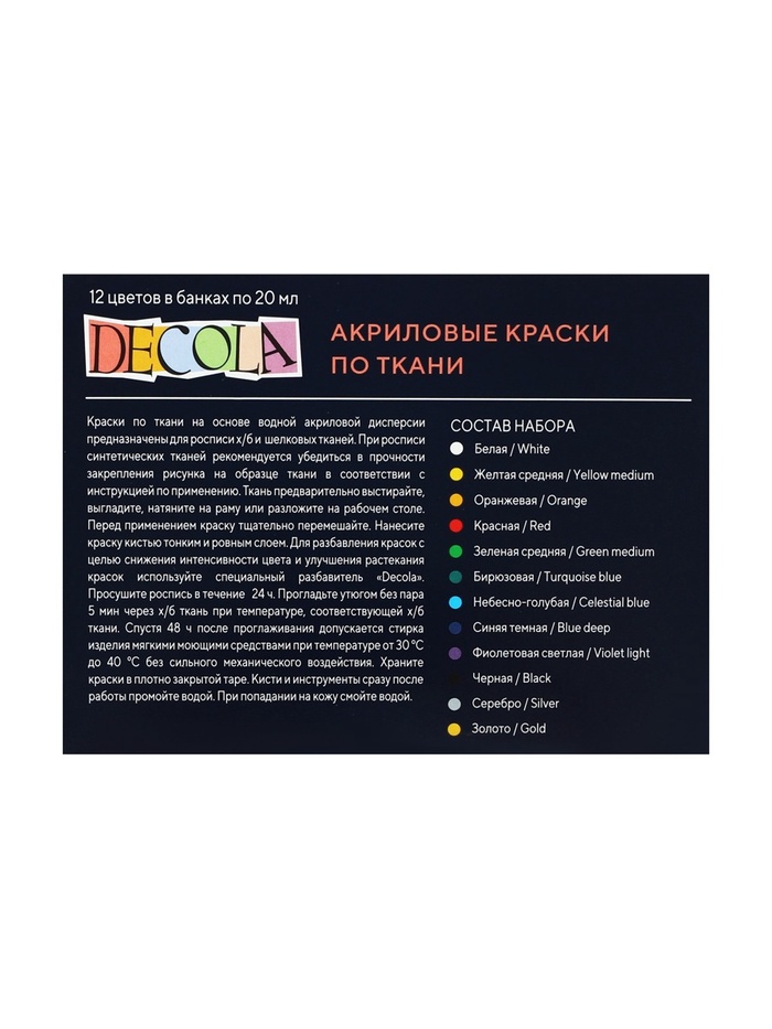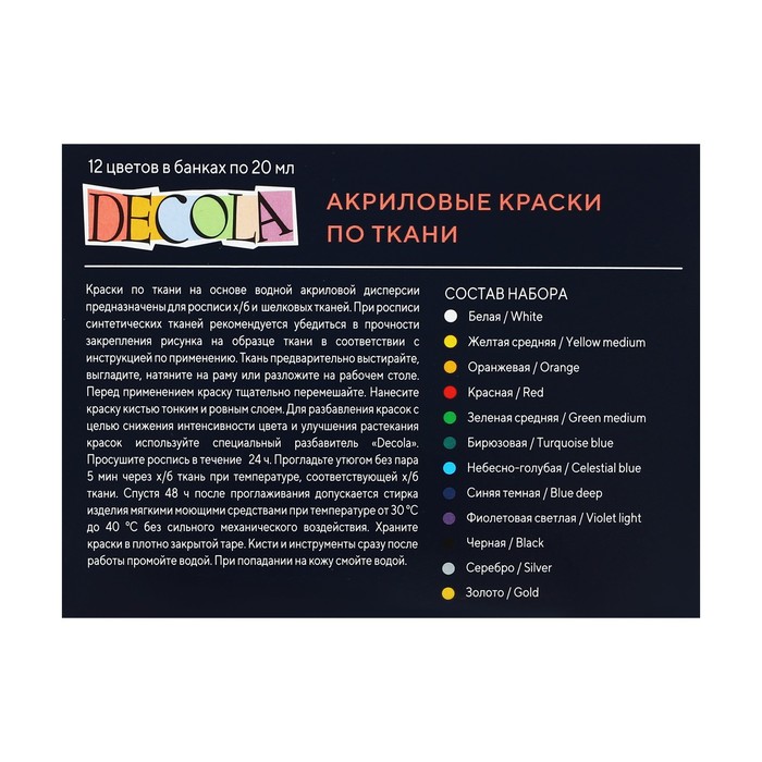 Акриловые краски по ткани "Decola" изготавливаются на основе водной акриловой дисперсии и образуют после высыхания прочную эластичную пленку на поверхности.
