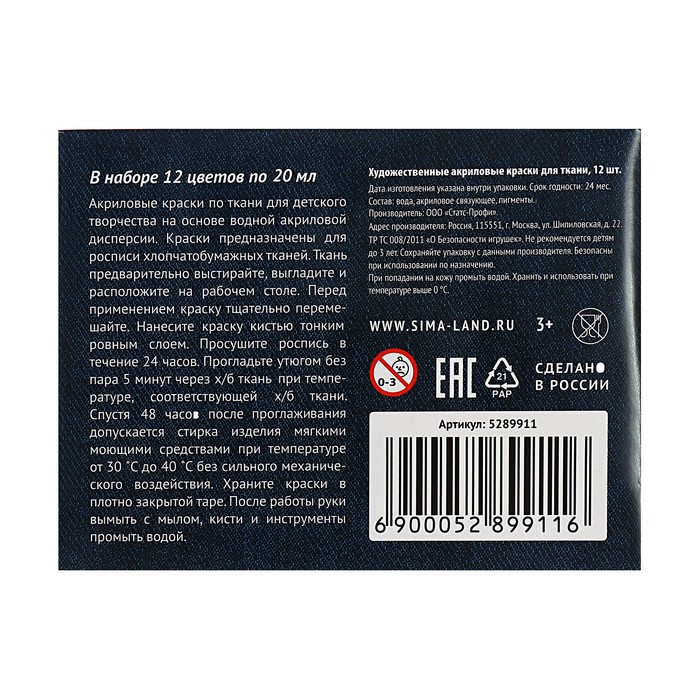 Краска по ткани, набор 12 цветов × 20 мл, морозостойкая, акриловая на водной основе, Calligrata — Характеристики
