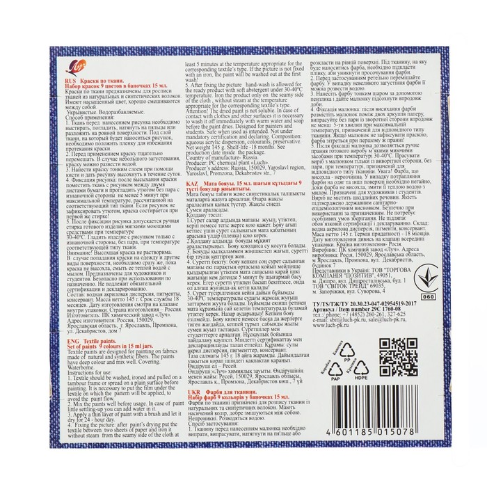 Краска по ткани, набор 9 цветов х 15 мл, Луч, акриловая на водной основе — Характеристики