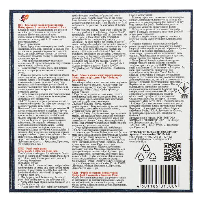 Краска по ткани, набор 9 цветов х 15 мл, Луч, перламутровая, акриловая на водной основе — Характеристики
