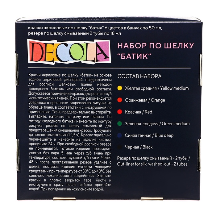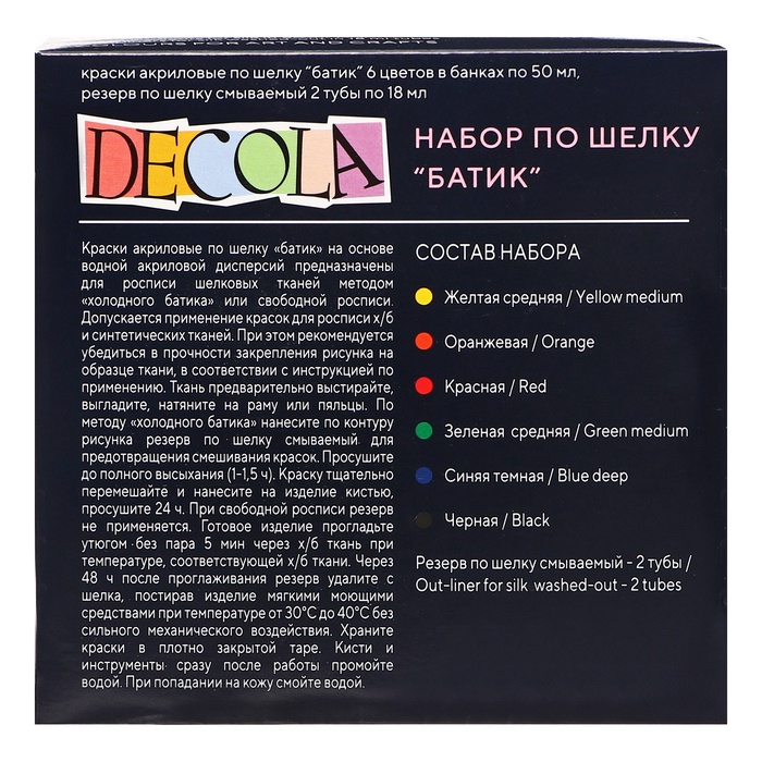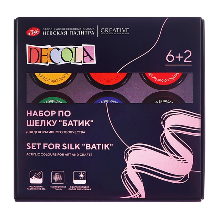 Краска по ткани (шелку), набор 6 цветов х 50 мл, ЗХК Decola "Батик" (резерв 2 штуки х 18 мл), акриловая на водной основе, (4441448) — Характеристики