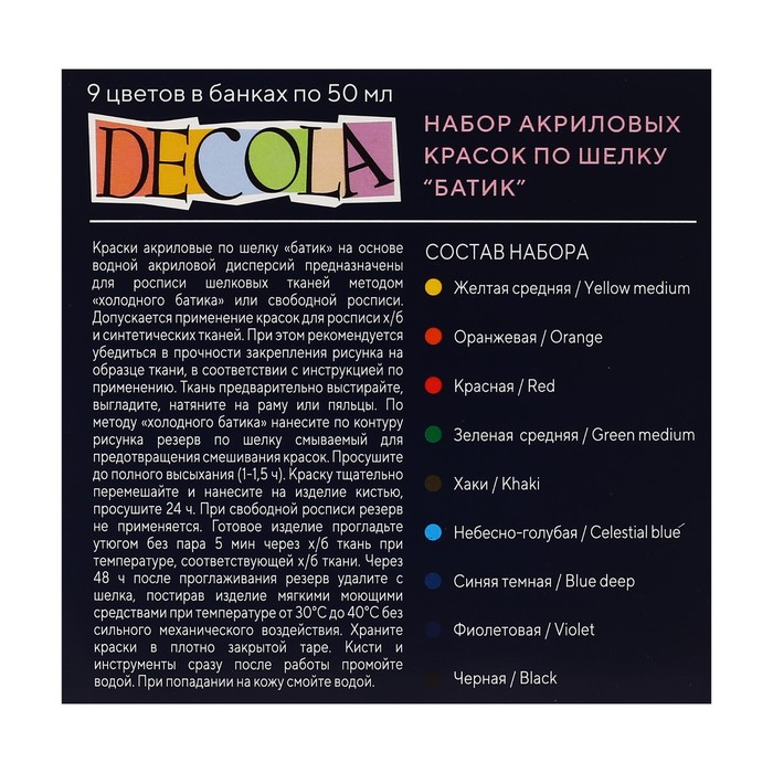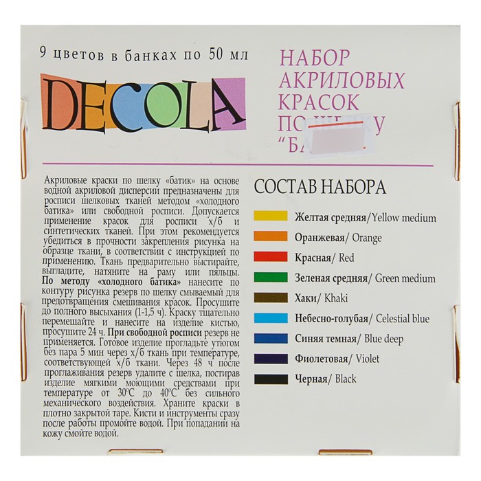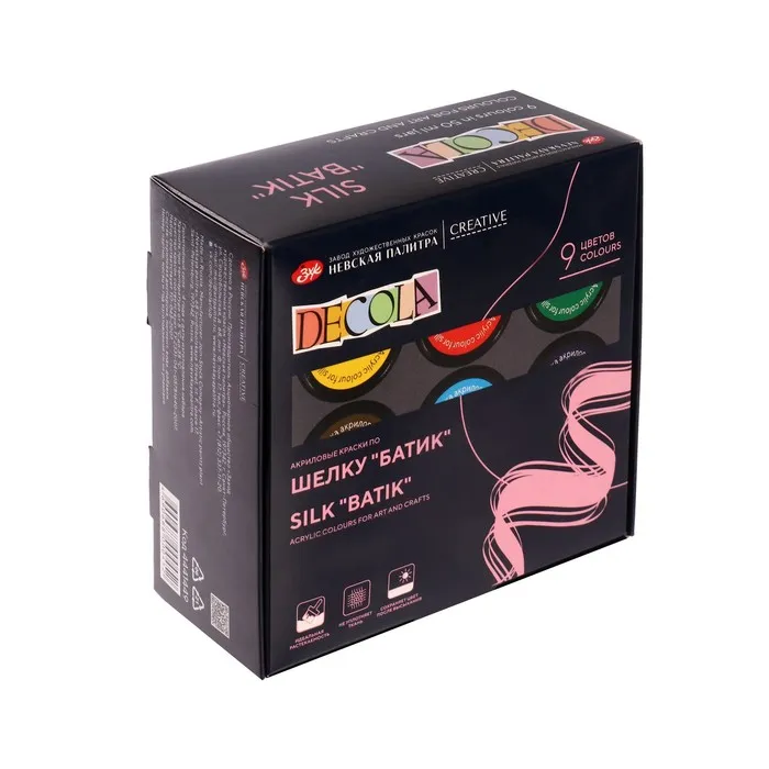 Акриловые краски по шелку "Decola" на основе водной акриловой дисперсии предназначены для росписи х/б и шелковых тканей методом холодного батика или свободной росписи.