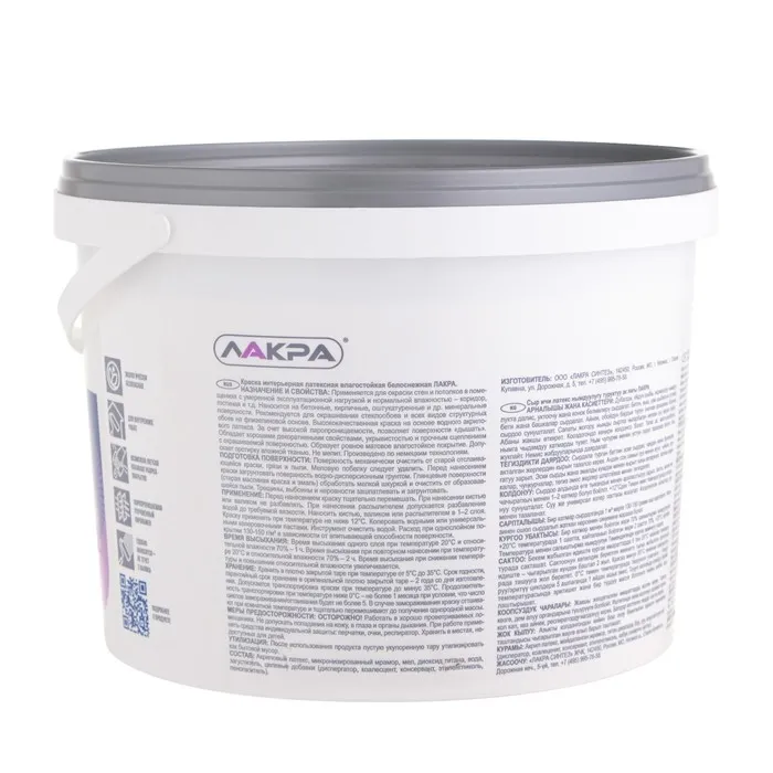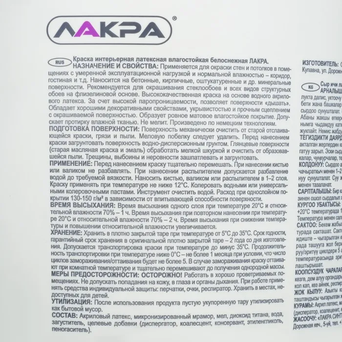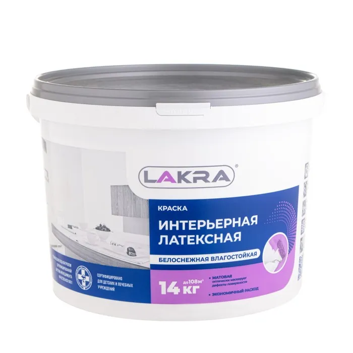 Краска водно-дисперсионная «ЛАКРА», латексная интерьерная влагостойкая, 14 кг — Характеристики