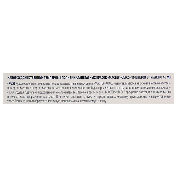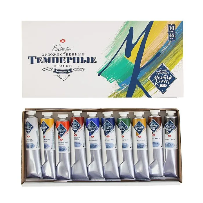Художественные темперные поливинилацетатные краски (ПВА) серии "Мастер-Класс" изготавливаются на основе высококачественных органических и неорганических пигментов и поливинилацетатной дисперсии и являются традиционным материалом для живописи. Благодаря тщательно отобранным компонентам темперные краски серии "Мастер-Класс" прекрасно подходят для живописных и декоративно-дизайнерских работ. Они легко наносятся на бумагу, картон, дерево.