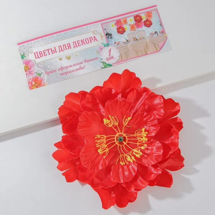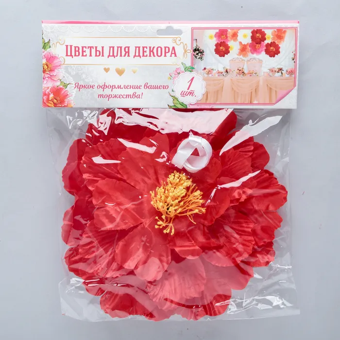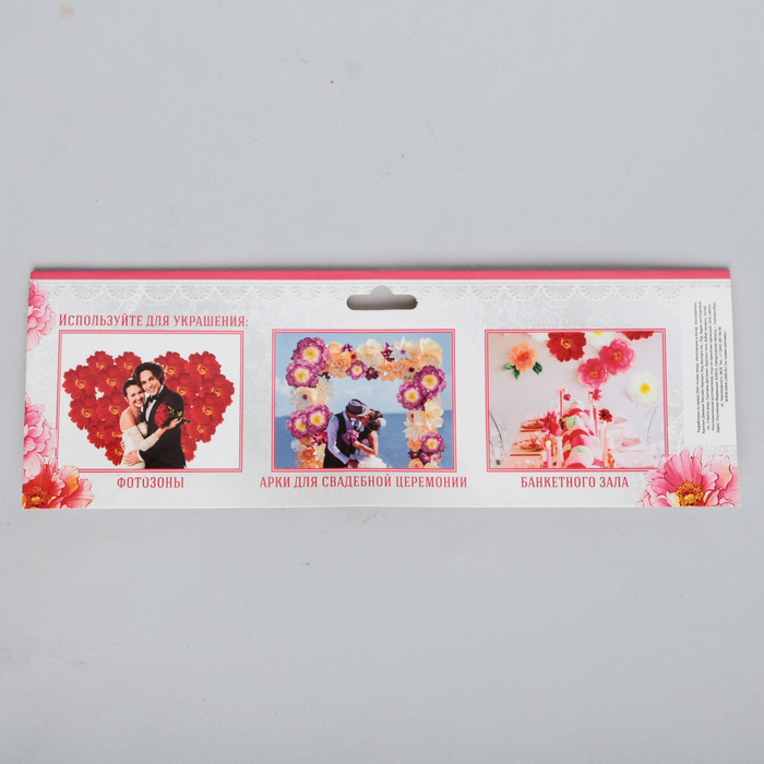Популярность в оформлении свадебного торжества набирают большие искусственные цветы. С их помощью вы сможете создать необычные элементы декора, использовать для украшения зала, стола молодожёнов, арки для церемонии, фотозоны, машины и многого другого. Цветы легко крепятся на клейкую ленту, также их можно привязать на атласную ткань, которая входит в набор.