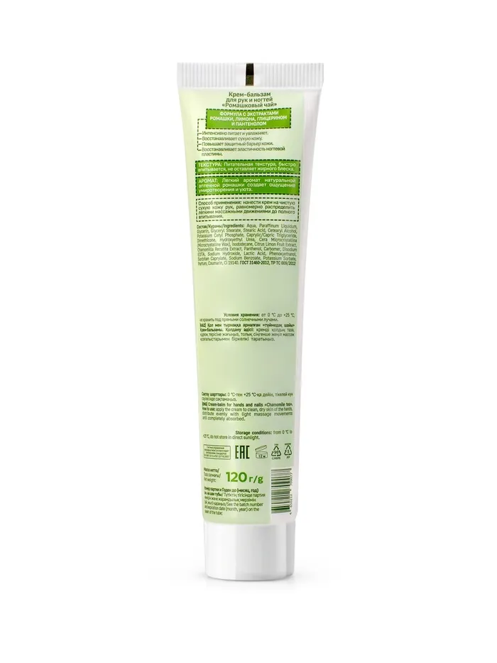 Формула крема содержит набор активных компонентов, способствующих здоровью и красоте коже рук. Экстракт ромашки - нежный природный антисептик, смягчает и успокаивает кожу. Экстракт лимона способствует укреплению стенок сосудов, уменьшает покраснения и выравнивает тон кожи. Глицерин - создает защитный барьер на поверхности кожи, препятствует потере влаги, делает кожу мягкой и увлажненной.