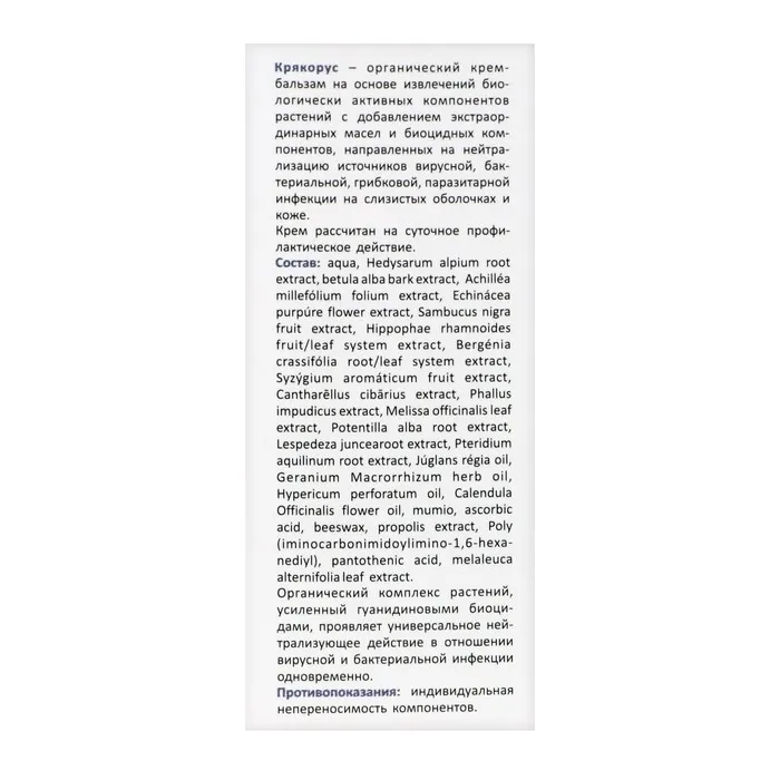 Состав: aqua, Hedysarum alpinum root extract, betula alba bark extract, Achilléa millefólium folium extract, Echinácea purpúre flower extract, Sambucus nigra fruit extract, Hippophae rhamnoides fruit/leaf system extract, Bergénia crassifólia root/leaf system extract, Syzýgium aromáticum fruit extract, Cantharēllus cibārius extract, Phallus impudicus extract, Melissa officinalis leaf extract, Potentilla alba root extract, Lespedeza juncearoot extract, Pteridium aquilinum root extract, Júglans régia oil, Geranium Macrorrhizum herb oil, Hypericum perforatum oil, Calendula Officinalis flower oil, mumio, ascorbic acid, beeswask, propolis extract, Poly (iminocarbonimidoylimino-1,6-hexanediyl), pantothenic acid, melaleuca alterni-folia leaf extract.