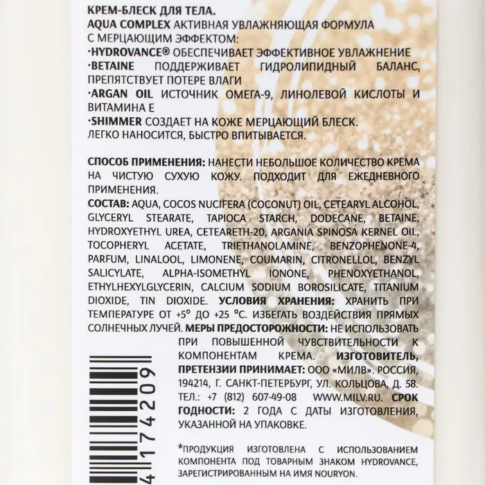 Лёгкий крем для тела с шиммером и роскошным цветочным ароматом. В состав средства входит aqua сomplex, обладающий великолепными увлажняющими свойствами.