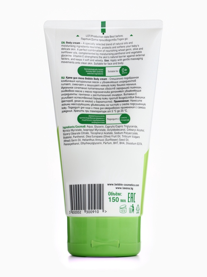 Легкий и нежный крем для тела Bebble может только дополнить неописуемое ощущение прикосновения к мягкой коже малыша. Идеально подходит для повседневного ухода, питает и увлажняет кожу. Крем для тела легко наносится и быстро впитывается, не оставляя жирных следов.