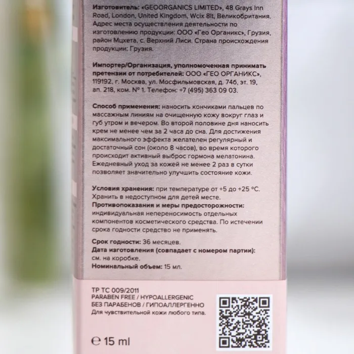 Способ применения: наносить кончиками пальцев по массажным линиям на очищенную кожу вокруг глаз и губ утром и вечером. Во второй половине дня наносить крем не менее чем за 2 часа до сна. Для достижения максимального эффекта желателен регулярный и достаточный сон (около 8 часов), во время которого происходит активный выброс гормона мелатонина. Ежедневный уход за кожей не менее 2 раз в сутки позволяет значительно улучшить состояние кожи.