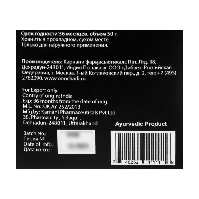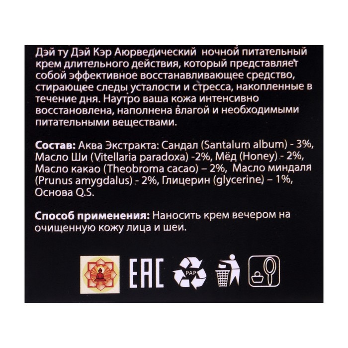 Состав: Вода, Сандал (Santalum album) — 3 %, Масло Ши (Vitellaria paradoxa) — 2 %, Мёд (Honey) — 2 %, Масло какао (Theobroma cacao) — 2 %, Масло миндаля (Prunus amygdalus) — 2 %, Глицерин (glycerine) — 1 %, основа — до нормы.