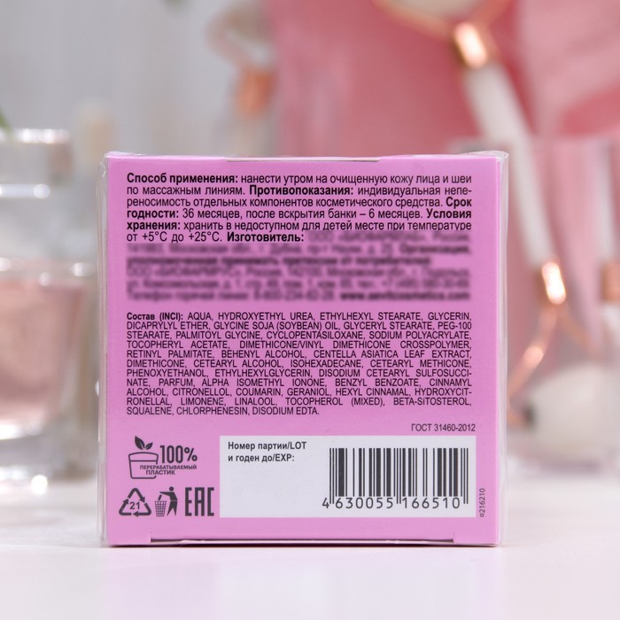Состав: aqua, hydroxyethyl urea, ethylhexyl stearate, glycerin, dicaprylyl ether, glycine soja (soybean) oil, glyceryl stearate, peg-100 stearate, palmitoyl glycine, cyclopentasiloxane, sodium polyacrylate, tocopheryl acetate, dimethicone/vinyl dimethicone crosspolymer, retinyl palmitate, behenyl alcohol, centella asiatica leaf extract, dimethicone, cetearyl alcohol, isohexadecane, cetearyl methicone, phenoxyethanol, ethylhexylglycerin, disodium cetearyl sulfosuccinate, parfum, alpha isomethyl ionone, benzyl benzoate, cinnamyl alcohol, citronellol, coumarin, geraniol, hexyl cinnamal, hydroxycitronellal, limonene, linalool, tocopherol (mixed), beta-sitosterol, squalene, chlorphenesin, disodium edta.