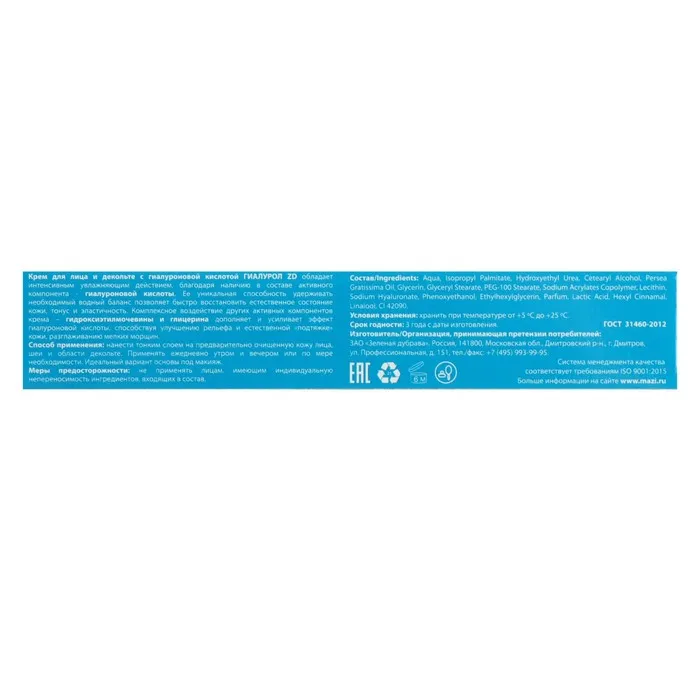 Крем обладает интенсивным увлажняющим действием, благодаря наличию в составе активного компонента - гиалуроновой кислоты. Ее уникальная способность удерживать необходимый водный баланс позволяет быстро восстановить естественное состояние кожи, тонус и эластичность. Комплексное воздействие других активных компонентов крема – гидроксиэтилмочевины и глицерина дополняет и усиливает эффект гиалуроновой кислоты, способствуя улучшению рельефа и естественной «подтяжке» кожи, разглаживанию мелких морщин.