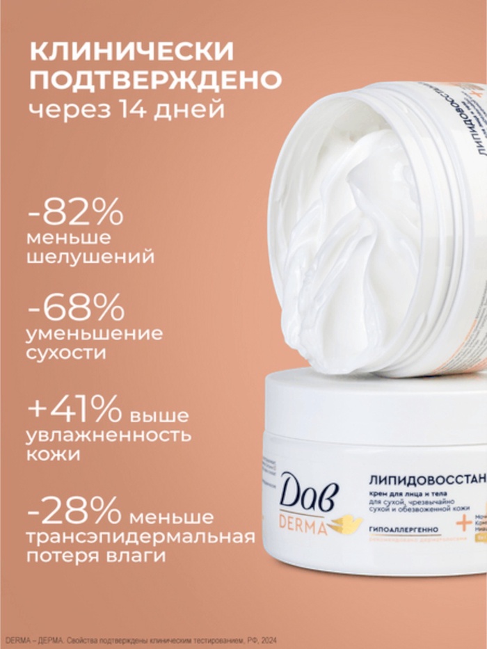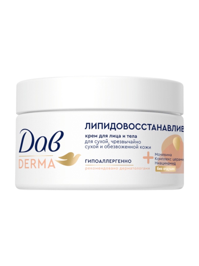 Увлажняющий крем для ухода за кожей лица и тела Дав Derma — это новинка для женщин, мужчин и девушек. Интенсивный крем для тела создан специально для сухой, обезвоженной и чрезвычайно сухой кожи, нуждающейся в интенсивном восстановлении.