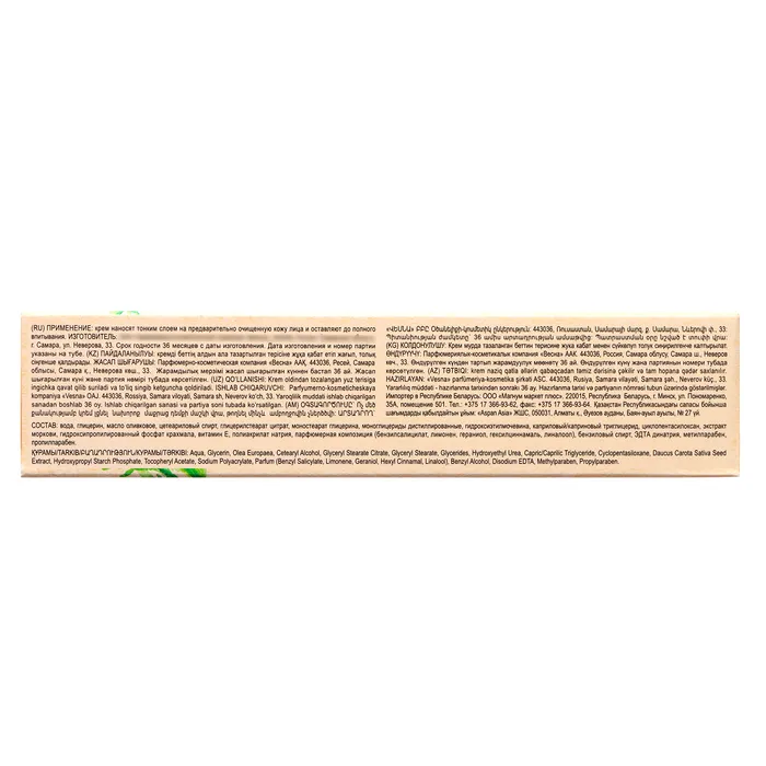 Состав: вода 7%, глицерин 10%, витамин е 7%, циклопентасилоксан 7%, оливы масло 10%, глицеридцтат 7%, цетеариловый спирт 7%, каприловый триглицерид 7%, моркови экстракт 10%, парфюмерная композиция 7%, мочевины гидроксиэтил 7%, глицерин моностеарат 7%, полиакрилат натрия 7%.