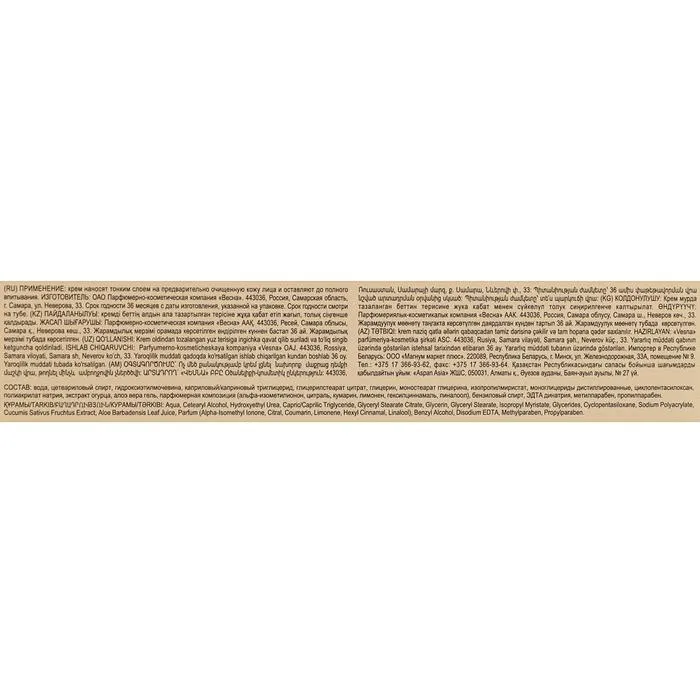 Крем предназначен для увлажнения и питания кожи лица. Он включает в себя специально подобранные компоненты, которые ухаживают за кожей, делая ее мягкой и шелковистой. Экстракт огурца восполнит жизненно необходимую коже влагу, одновременно увлажняя и тонизируя ее. Придает лицу здоровый цвет, освежая его. Крем сохраняет молекулы воды глубоко в коже, предотвращая недостаток влаги. Гель алоэ вера успокаивает кожу лица, повышает ее эластичность, а также смягчает кожу, наполняя питательными веществами. Глицерин смягчает и увлажняет кожу, делает ее мягкой и шелковистой.
