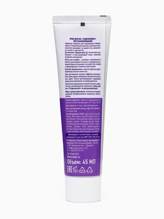 Крем для ног «Гидропилинг» восстанавливающий разработан для ежедневного ухода за сухой огрубевшей кожей стоп.